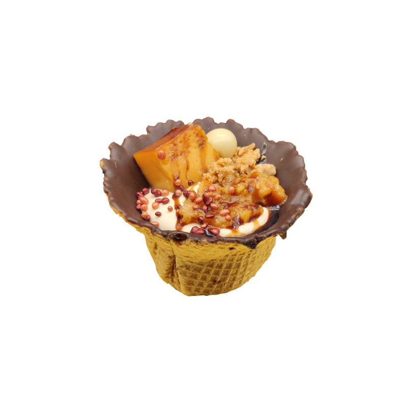 El Crepe Nido Tocino envuelve helado rico de yemas frescas y toque caramelo en crepe dorado fino, simulando nido con nibs tostados para ruptura placentera. Compacto y atractivo en vitrina, genial solo o con almendras para contrastes sublimes. Fusión delicada para antojos refinados.