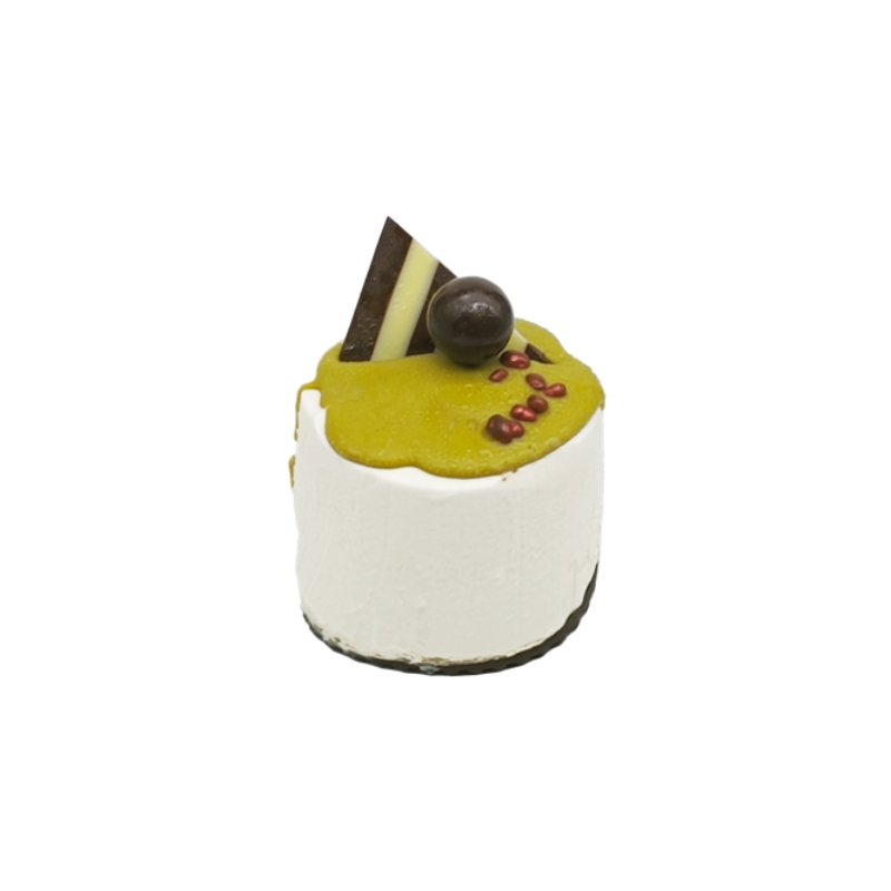 Postre helado de Mango y Frambuesa es una mousse gourmet de mango veteado con chocolate, decorada con mermelada de frambuesa, azulejo crujiente de chocolate y bola de cereal, ideal para vitrinas premium.