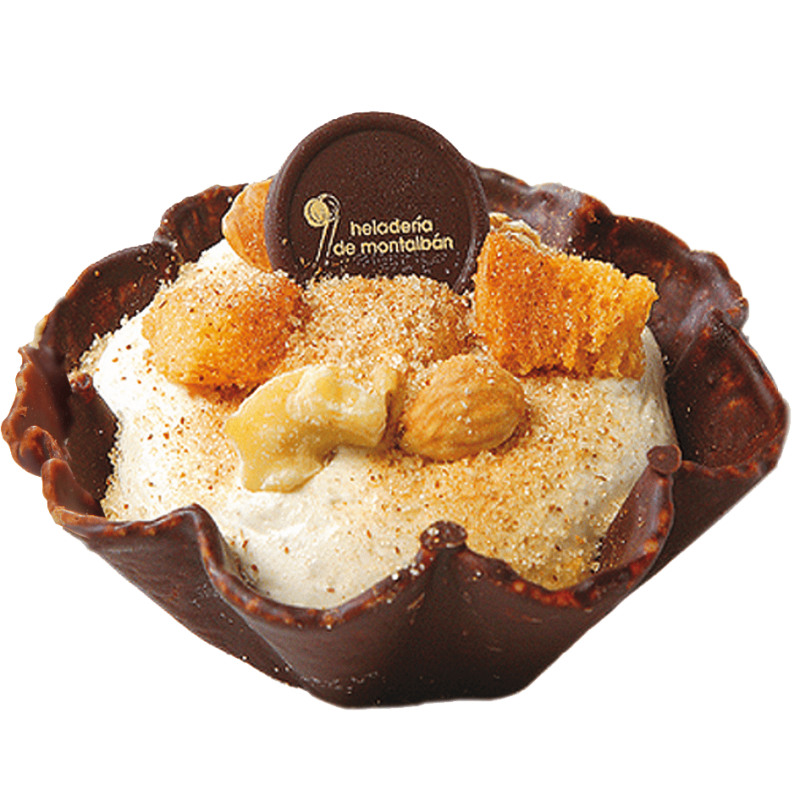 Postre helado individual consistente en una tulipa de barquillo bañada con cobertura de chocolate, rellena de helado de leche sabor a gachas y decorada con cuscurrones, almendras, nueces, azúcar en grano, canela molida y chocolatina decorativa.