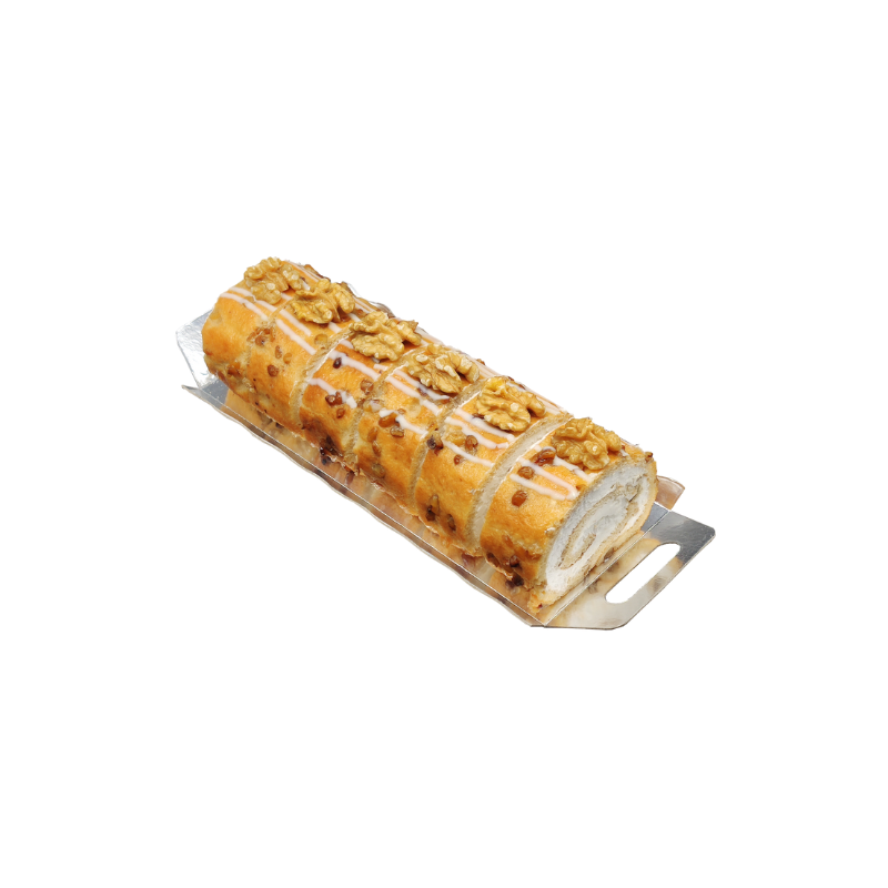 Gitanitos de Nueces son mini brazos gitanos artesanales, bizcocho enrollado relleno de crema pastelera cremosa salpicada de nueces crujientes para contraste.