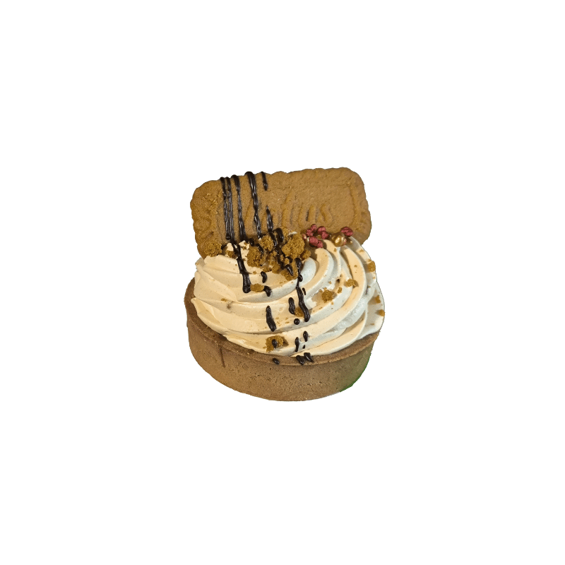 Tartaleta Lotus es un dulce artesanal con base crujiente de galleta triturada, rellena de cremosa crema Lotus de speculoos y decorada con trocitos de galleta Lotus para crunch extra.