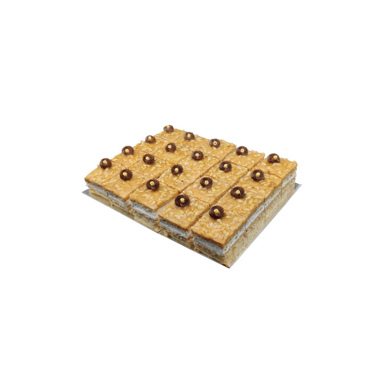 Plancha Premium Milhojas Con Piñones es un dulce gourmet en bandejas de 20 porciones, combinando bizcocho esponjoso, hojaldre crujiente, crema pastelera sedosa, nata montada ligera y piñones tostados aromáticos.