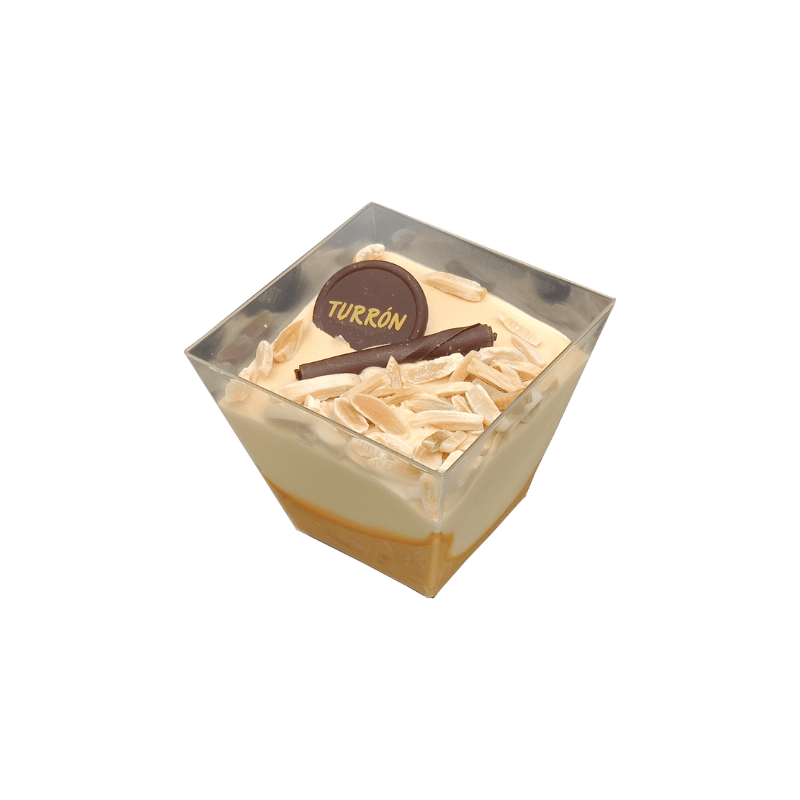Copa helado Premium de Turrón es un postre artesanal en vaso cristal transparente con helado cremoso de turrón de almendra, trocitos crujientes de almendra tostada y salsa de miel ligera .