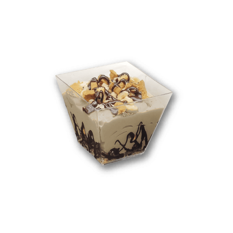 Cada copa individual mantiene sabor avellanado rico y textura densa en cristal transparente, ideal para vitrina inclusiva o dietas especiales con indulgencia saludable.