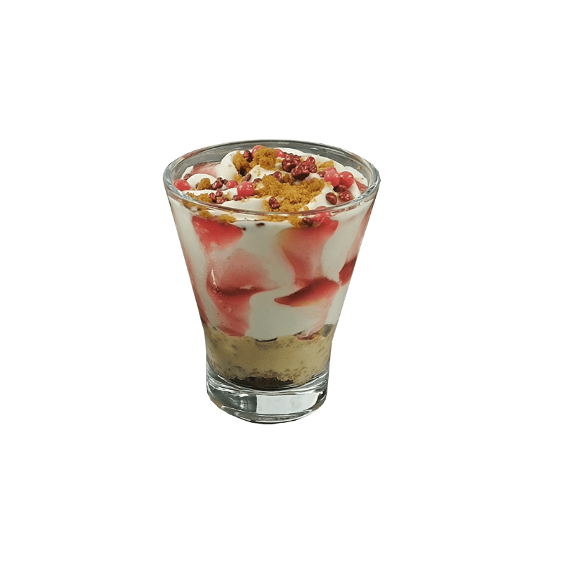 Servida en vaso cristal transparente que exhibe capas blanco rosado atractivas, ideal para vitrina veraniega o postre gourmet ligero con frescura frutal.