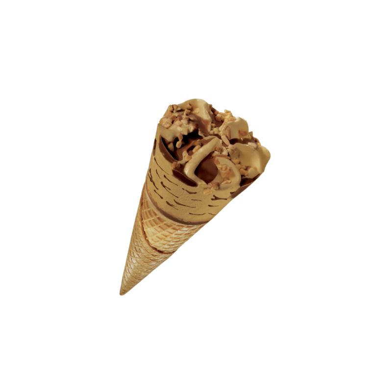 Cono helado Turrón es un postre helado económico en cono crujiente, relleno de helado cremoso sabor turrón suave con leche y miel, perfecto para menús de hostelería navideña o tradicional.