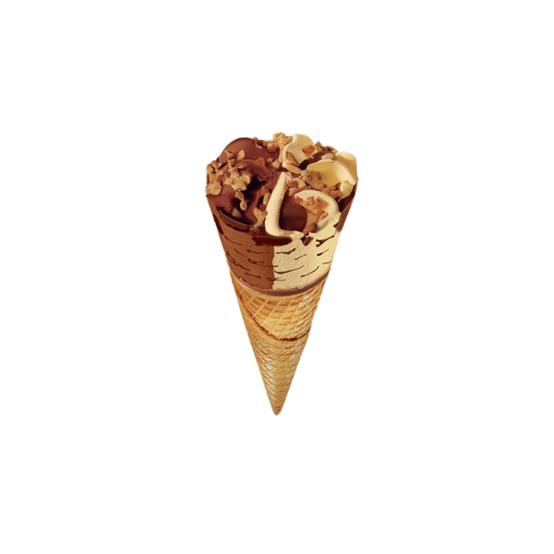 El Cono helado Vainilla y Chocolate ofrece ración doble sabor con helado vainilla suave a base de leche y yemas junto a chocolate fundente equilibrado, en cono waffle ligero para servicio rápido .