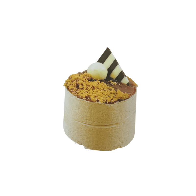 Semifrío en monoporción de pastelería, con una suave mousse de crema tostada y galletas María. Una propuesta ideal para completar tu vitrina de postres congelados con un toque equilibrado de caramelo y flor de sal.