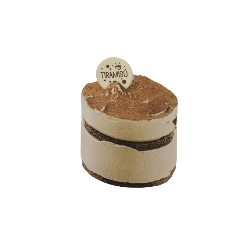 Postre helado Tiramisú es una mousse gourmet de mascarpone con café espresso y cacao amargo, sobre base de galleta embebida, ideal para vitrinas premium.