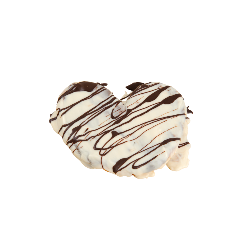 La Palmera rayada blanca elabora hojaldre dorado y hojaldrado que envuelve generoso relleno de chocolate intenso, coronada con elegante cobertura de chocolate blanco veteada artísticamente con chocolate negro para contraste visual sofisticado y sabor equilibrado .