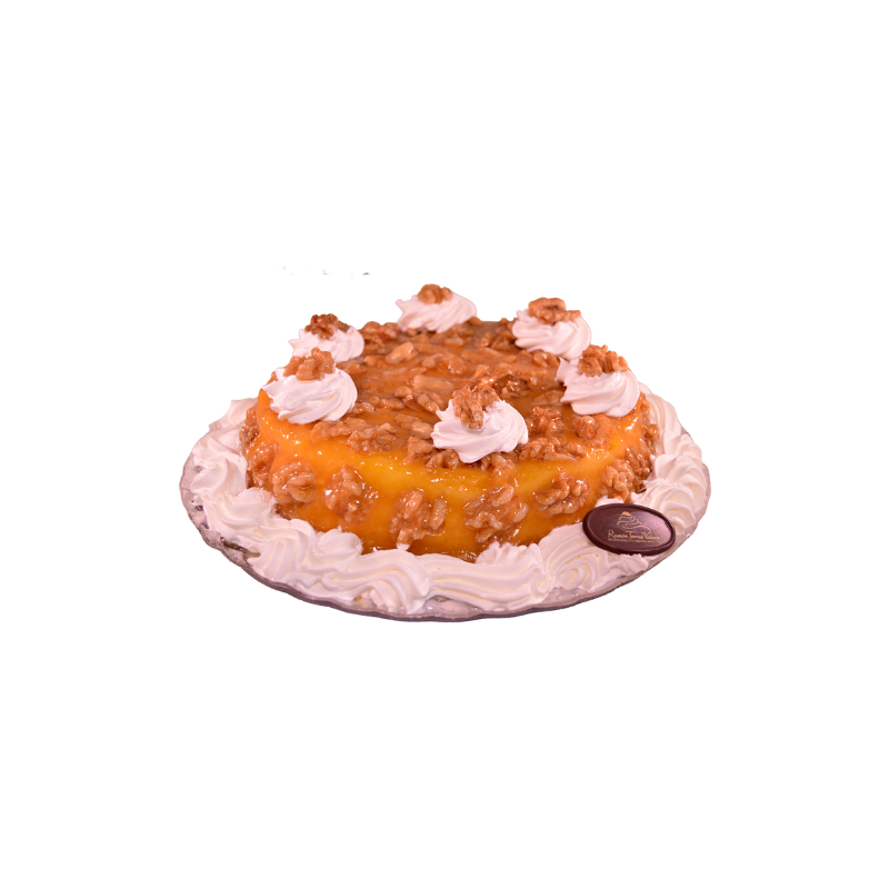 Tarta Nueces y Crema Pastelera es una tarta gourmet con base de bizcocho esponjoso, rellena de cremosa crema pastelera, decorada con nueces tostadas crujientes y coronada con nata montada suave, perfecta para celebraciones o vitrinas premium.