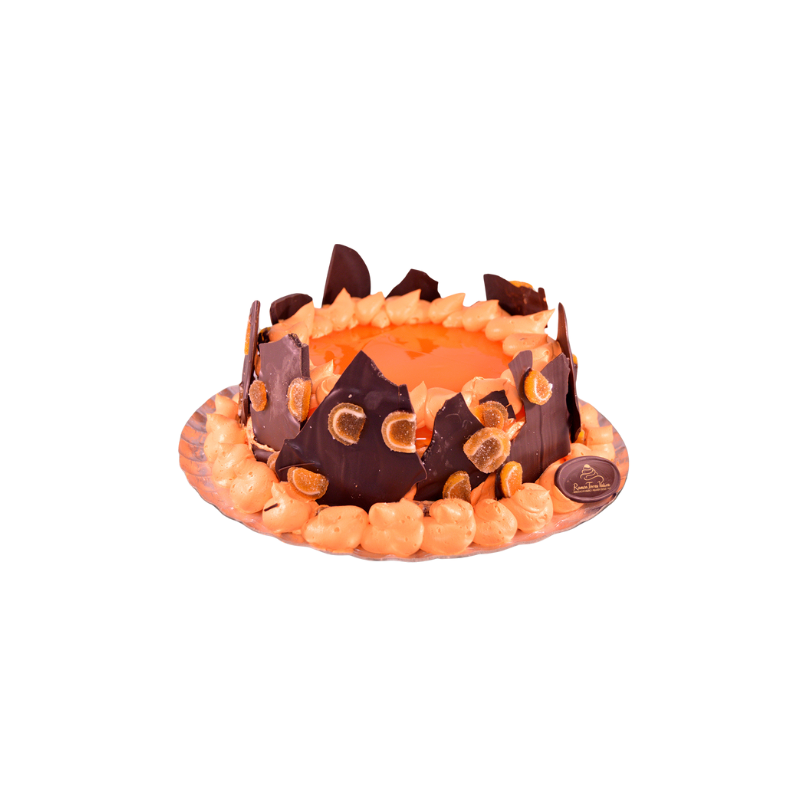 La Tarta Mandarina fusiona bizcocho húmedo con generoso relleno de chocolate intenso y mousse cítrica de mandarina fresca que despierta los sentidos, decorada con cristales translúcidos de mandarina que brillan, conchas crujientes de chocolate y gominolas masticables de mandarina para contraste textural inolvidable .
