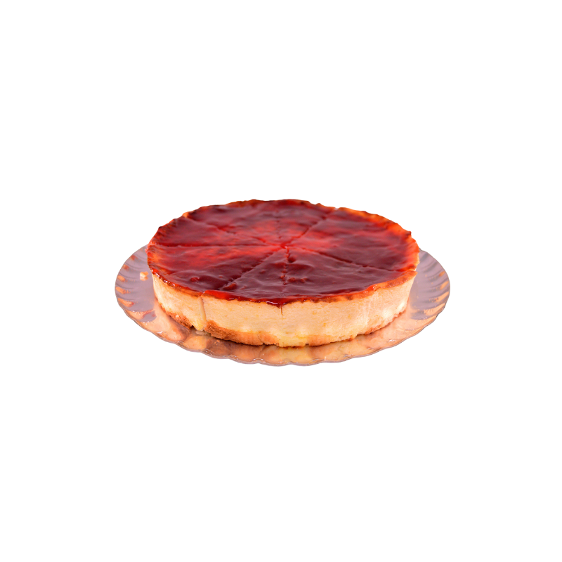 La Tarta de Queso Manchega Fresa presenta base crujiente de bizcocho que sostiene generosa capa de queso manchego suave y aterciopelado, terminada con crema de fresa natural que decora con color intenso y sabor ácido dulce equilibrado .