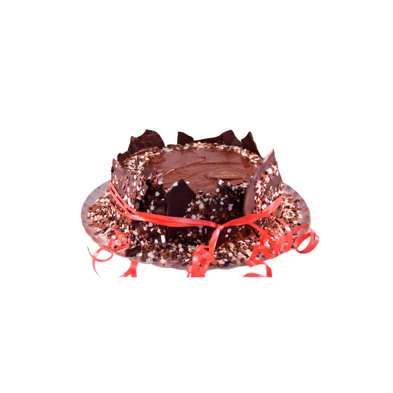 Pastel Nocciola Troceado es un exquisito pastel artesanal de hojaldre crujiente con crema de cacao intensa, decorado con crema adicional de cacao y avellana, en 12 raciones individuales .