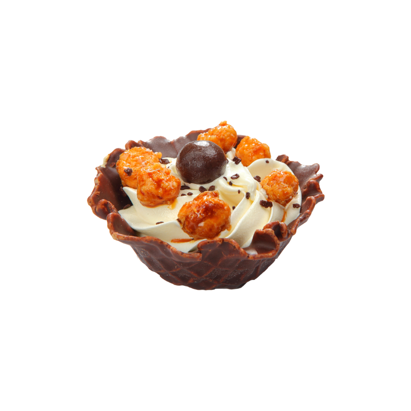 Tulipa Tahití con helado de vainilla Tahití y nueces de Macadamia caramelizadas, servida en galleta bañada en chocolate. Cremosa, crujiente y deliciosamente aromática.